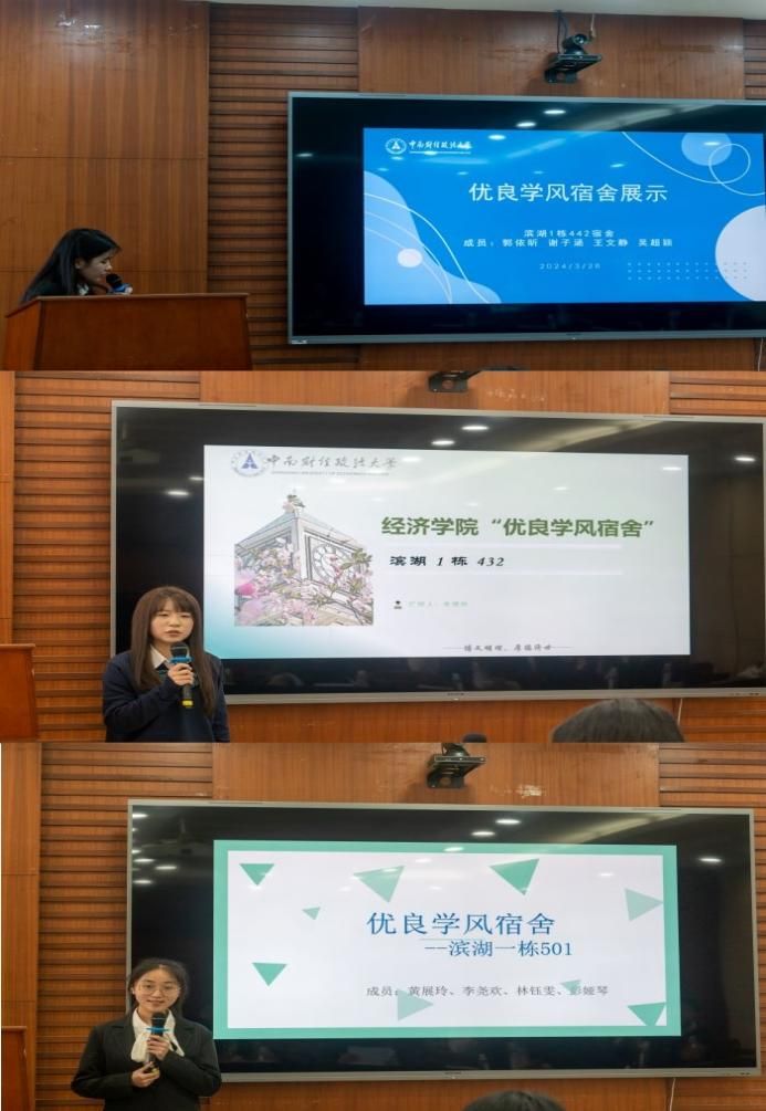 最后,“優良學風宿舍”進行答辯。濱湖1棟442、濱湖1棟432、濱湖1棟501的三位寢室長從學習成果、日常生活和室風營造三方面闡述了各寢室在學風建設方面的成果,他們一心向學的良好學風和獨特的寢室文化引起了在場同學們的陣陣驚嘆。