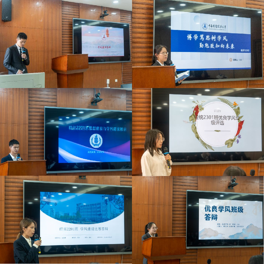 經過前期評審,共有6個班級進入“優良學風班級”答辯環節。其中,國商2301班學習委員王馨怡從學習成果、課內活動、課外實踐以及未來展望四個方面介紹了班級的學風建設情況。經濟2202班學習委員呂佳以班級整體的精神面貌為引入,從學風建設的目的、內容以及現實意義三個方面對班級的學風建設工作進行了具體而生動的介紹,并表達了對樹立班級學風的進一步展望。經法2201班班長彭虎則從思想建設、學習成果、學術科研三個角度總結班級在學風建設方面的成果。