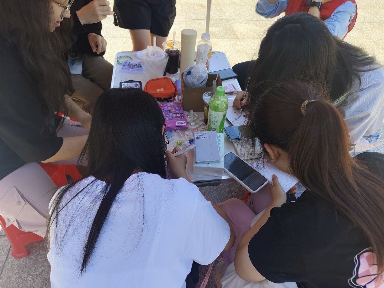 活動(dòng)尾聲將近,志愿者們開(kāi)始了最后一個(gè)活動(dòng)——心語(yǔ)串珠。一顆顆晶瑩剔透的珠子,在陽(yáng)光的照耀下折射暖光。成員們小心翼翼地穿著珠子,圍坐在小桌旁,一串接著一串,留下滿載心意禮物……