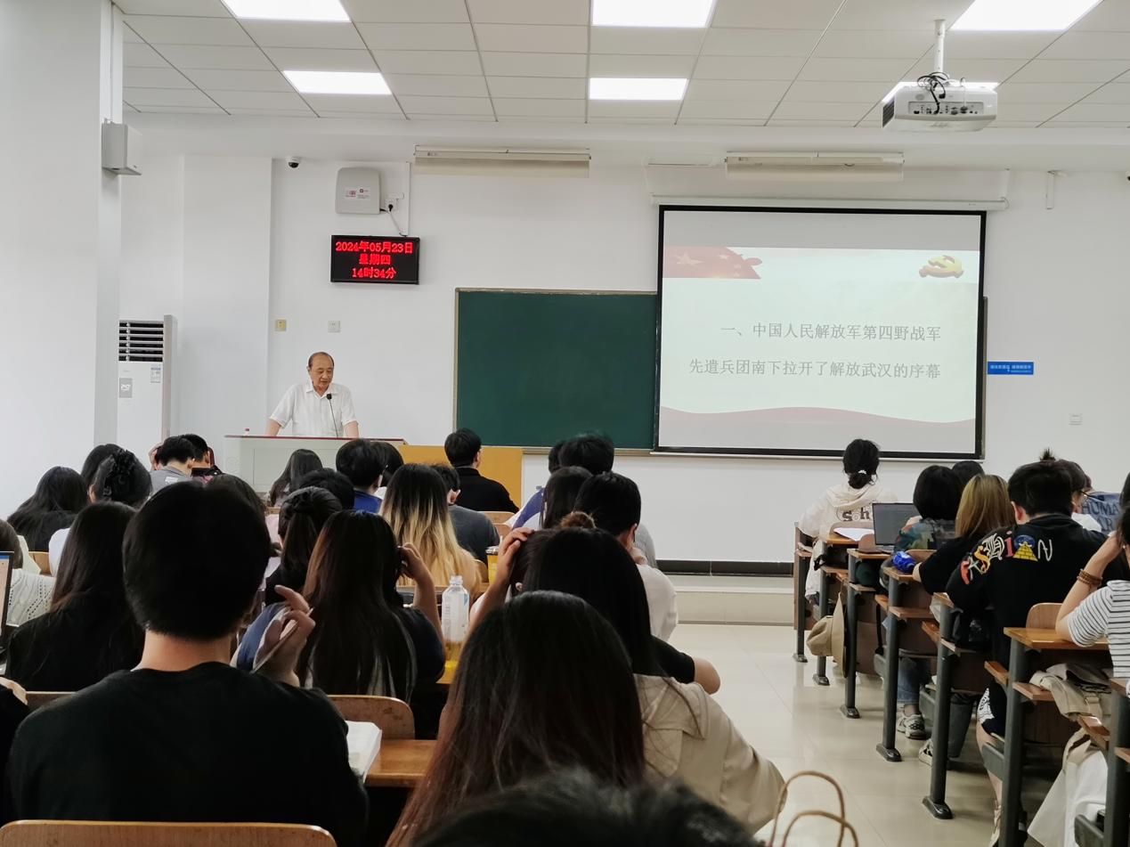 胡江濱教授從“中國人民解放軍第四野戰軍先遣兵團南下拉開了解放武漢的序幕”“武漢是一座英雄的城市”“武漢解放的重大意義”三個方面來闡述解放武漢的過程以及歷史意義。