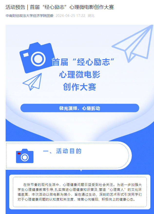 電影是一場心靈間的對話,擁有強(qiáng)大的文化表現(xiàn)力量,因而被稱為“第七藝術(shù)”。隨著短視頻的流行與相關(guān)技術(shù)的發(fā)展,拍攝一部電影的門檻越來越低,青年學(xué)生們樂于記錄生活,也具備以影像截取精彩瞬間的技能。為了引導(dǎo)廣大學(xué)生關(guān)注和重視心理健康問題,宣傳心理健康知識,工作站舉辦了首屆“經(jīng)心勵志”心理微電影創(chuàng)作大賽。本次比賽以微電影為媒介,將主題定為“閱己、越己、悅己”“心靈港灣”,旨在通過學(xué)生喜聞樂見的作品形式,深入挖掘同學(xué)們內(nèi)心的情感世界,傳遞社會正能量。活動吸引了學(xué)院各年級學(xué)生的積極參與,經(jīng)過篩選、評審等環(huán)節(jié),共選出三部優(yōu)秀作品。這些作品以獨(dú)特的視角、生動的情節(jié)和深刻的內(nèi)涵,展現(xiàn)了同學(xué)們在面對生活壓力、情感困擾時(shí)的掙扎與成長,傳遞了積極向上、勇于面對挑戰(zhàn)的精神。